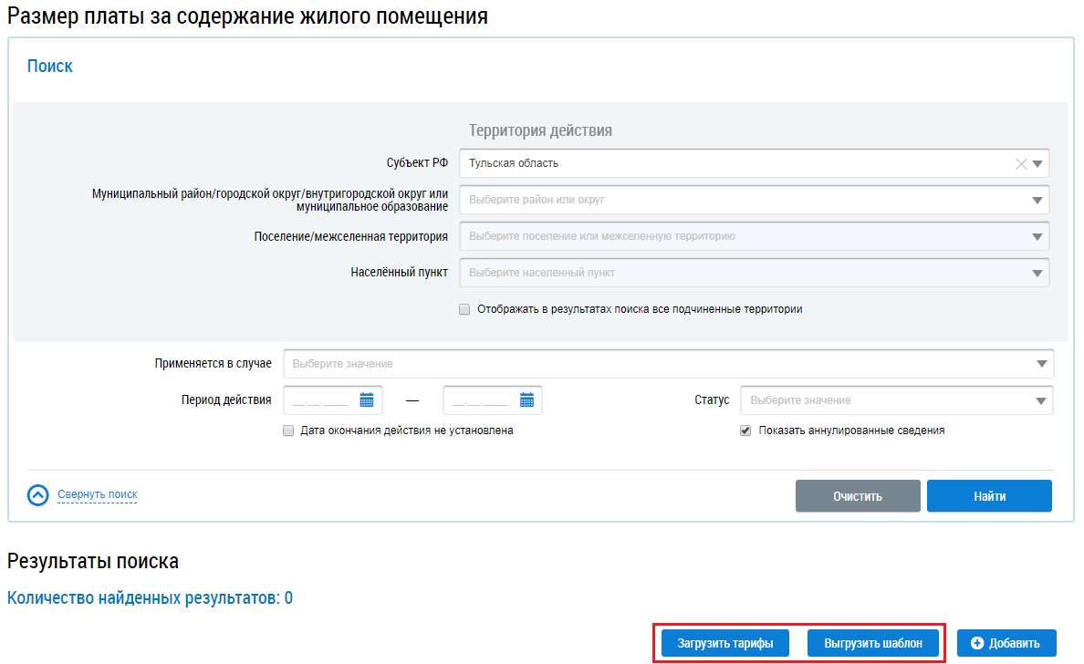 Для загрузки информации о размере платы за содержание жилого помещения нажмите на кнопку Выгрузить шаблон на странице Размер платы за содержание жилого помещения.
