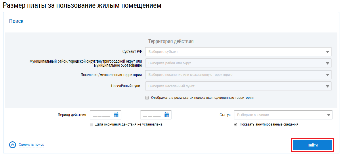 При необходимости установите флажок Отображать в результатах поиска все подчиненные территории, Дата окончания действия не установлена, Показать аннулированные сведения и нажмите на кнопку Найти.