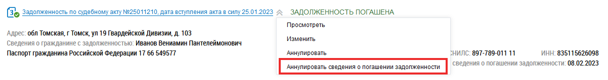 Для аннулирования сведений о погашении задолженности раскройте контекстное меню размещенных сведений в статусе Задолженность погашена и выберите пункт Аннулировать сведения о погашении задолженности.