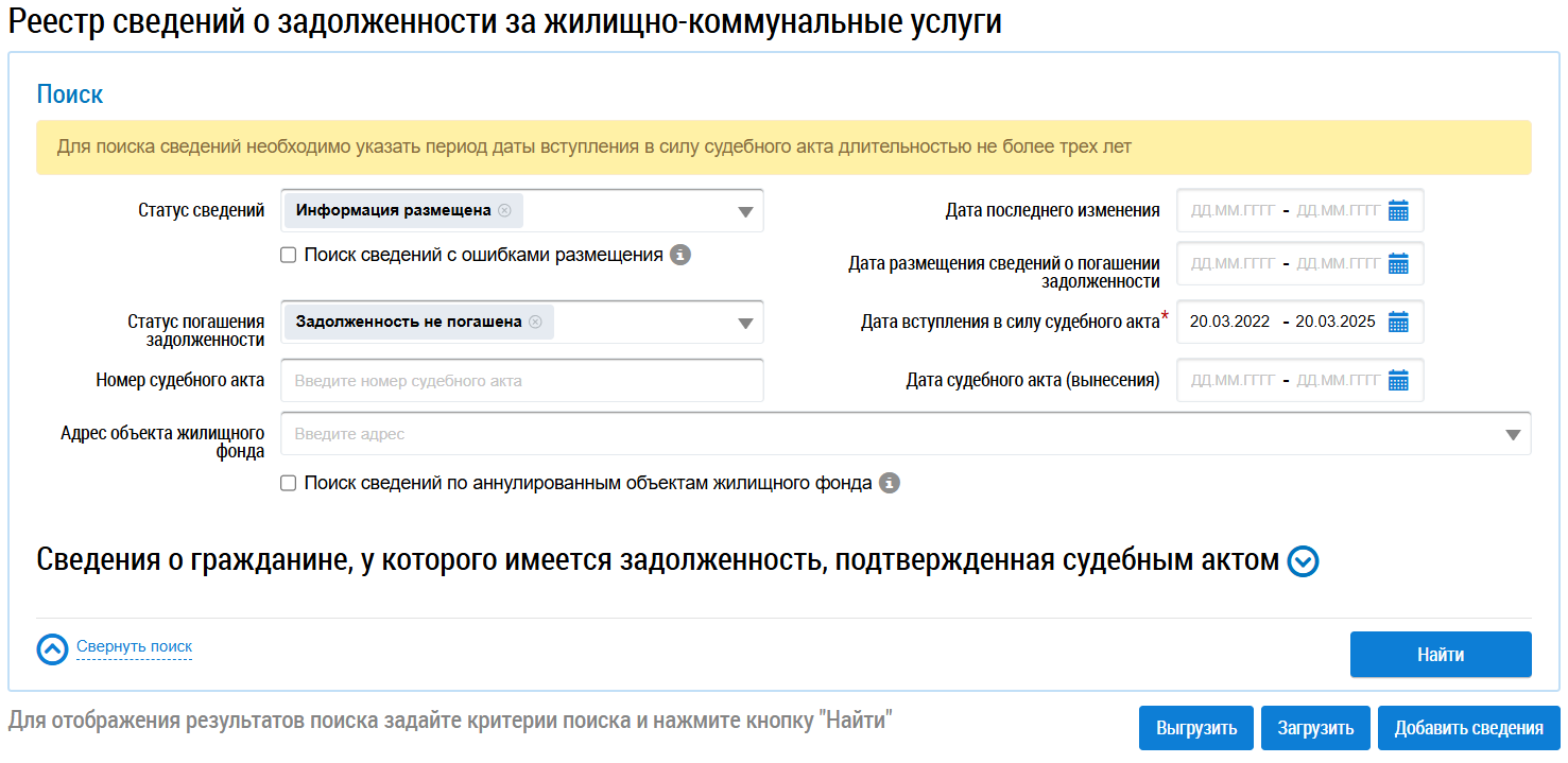 Отображается страница Реестр сведений о задолженности за жилищно-коммунальные услуги.