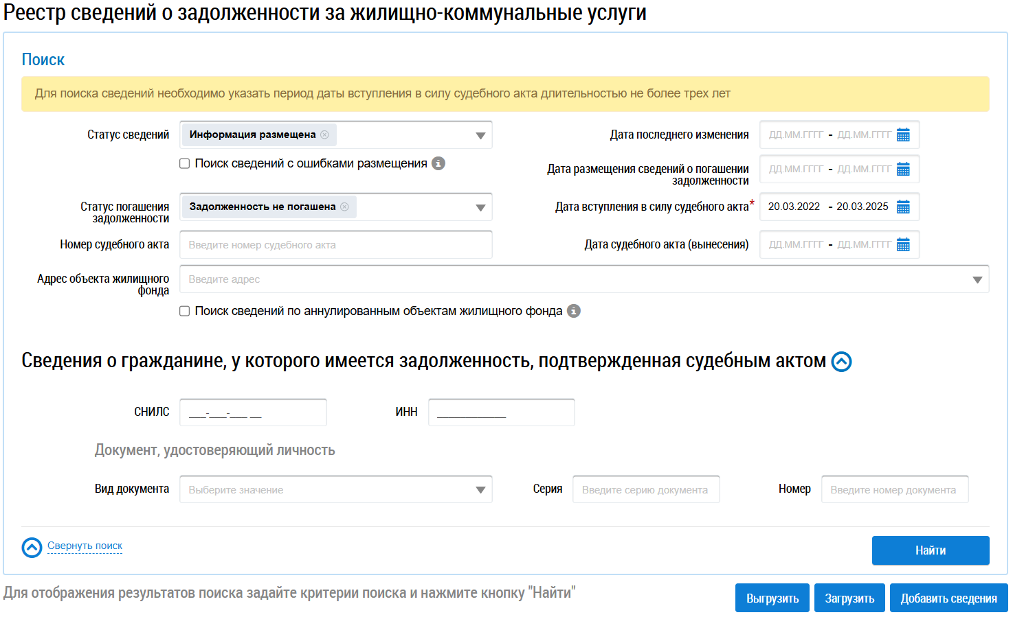 - Дата вступления в силу судебного акта. Это поле обязательно для заполнения. Для поиска сведений необходимо указать период даты вступления в силу судебного акта длительностью не более трех лет. При размещении сведений о задолженности может возникать ошибка. Для поиска сведений с ошибками размещения установите флажок Поиск сведений с ошибками размещения.
