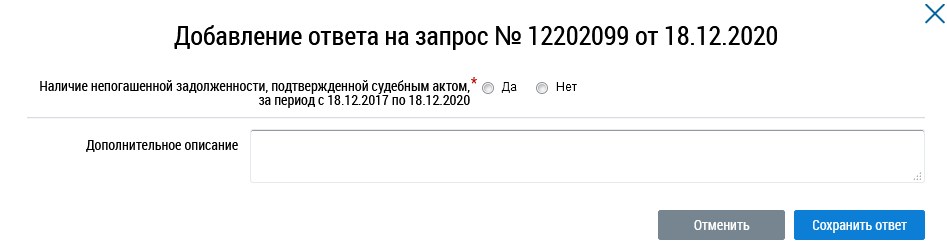 При отсутствии непогашенной задолженности установите переключатель в положение Нет. При необходимости укажите дополнительную информацию в поле Дополнительное описание. Затем нажмите на кнопку Сохранить ответ.