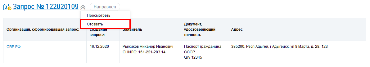 Отзыв запроса