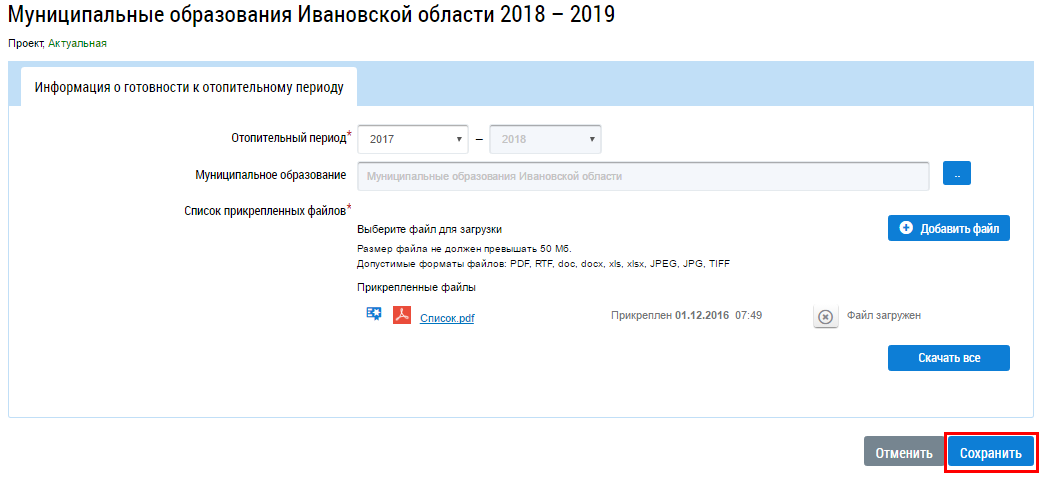 На отобразившейся странице редактирования информации о готовности к отопительному периоду внесите изменения и нажмите на кнопку Сохранить.