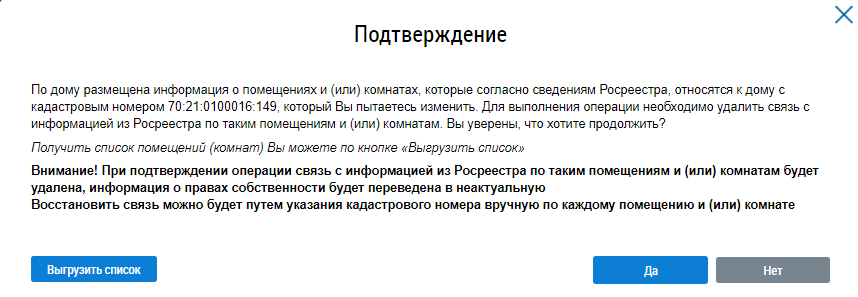 Примечание:При подтверждении операции связь с информацией из Росреестра по таким помещениям и (или) комнатам будет удалена, информация о правах собственности будет переведена в неактуальную.