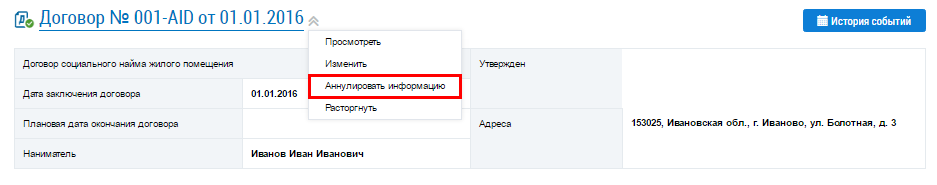 Для аннулирования информации о договоре социального найма выберите пункт контекстного меню Аннулировать информацию.