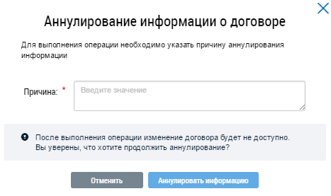 Напишите причину аннулирования информации о договоре и нажмите на кнопку Аннулировать информацию.
