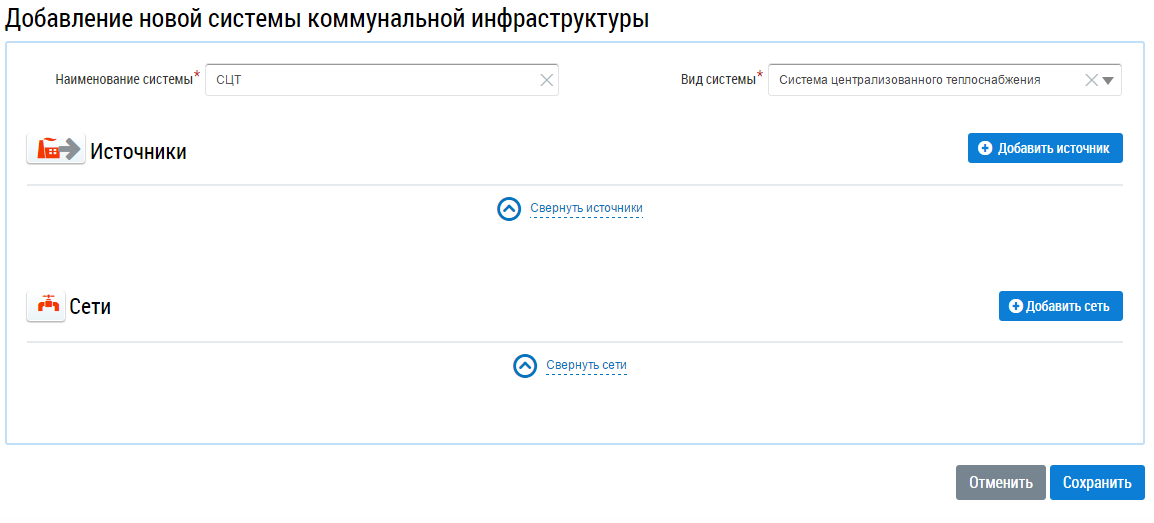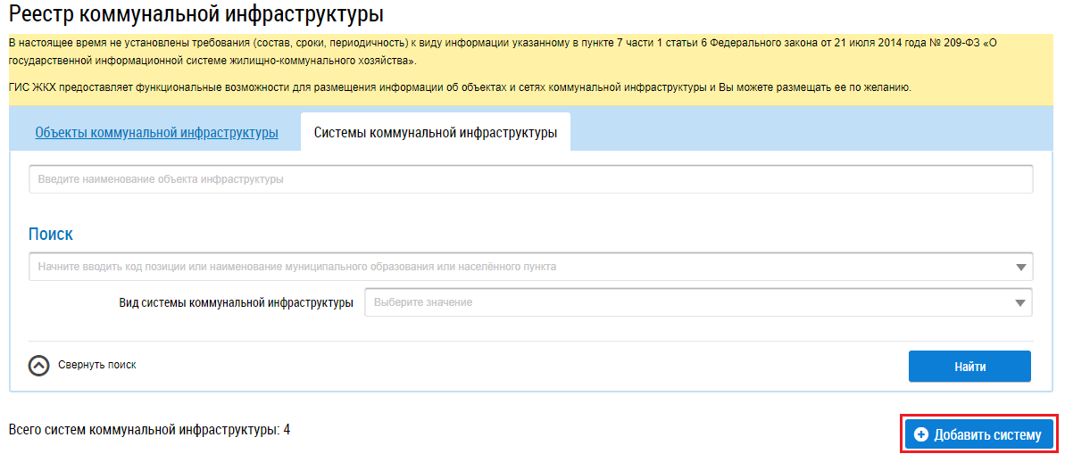 Для добавления системы коммунальной инфраструктуры необходимо на вкладке Системы коммунальной инфраструктуры нажать на кнопку Добавить систему.
