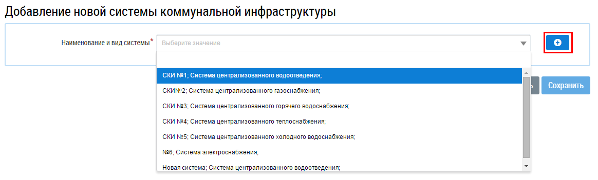 Введите наименование системы в поле Наименование системы. Выберите значение из выпадающего списка в поле Вид системы и нажмите на кнопку Сохранить. На странице Добавление новой системы коммунальной инфраструктуры выберите добавленную систему из выпадающего списка. В результате отобразятся дополнительные поля для заполнения.