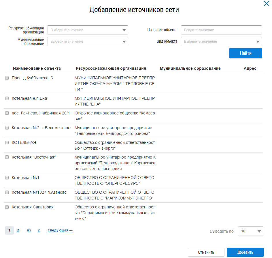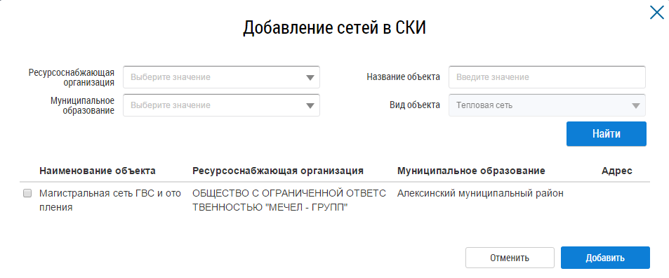 Воспользуйтесь блоком поиска, установите переключатель в столбце Наименование объекта и нажмите на кнопку Добавить.