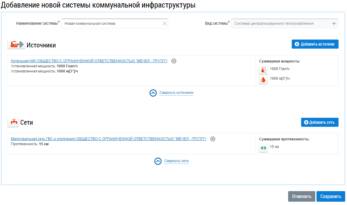 Добавленные сведения отображаются на странице Добавление новой системы коммунальной инфраструктуры.
