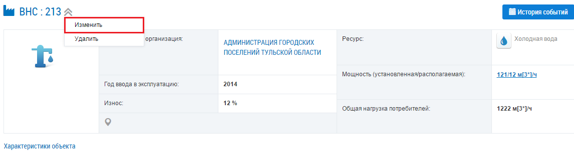 Для изменения характеристик объекта необходимо в Реестре коммунальной инфраструктуры для