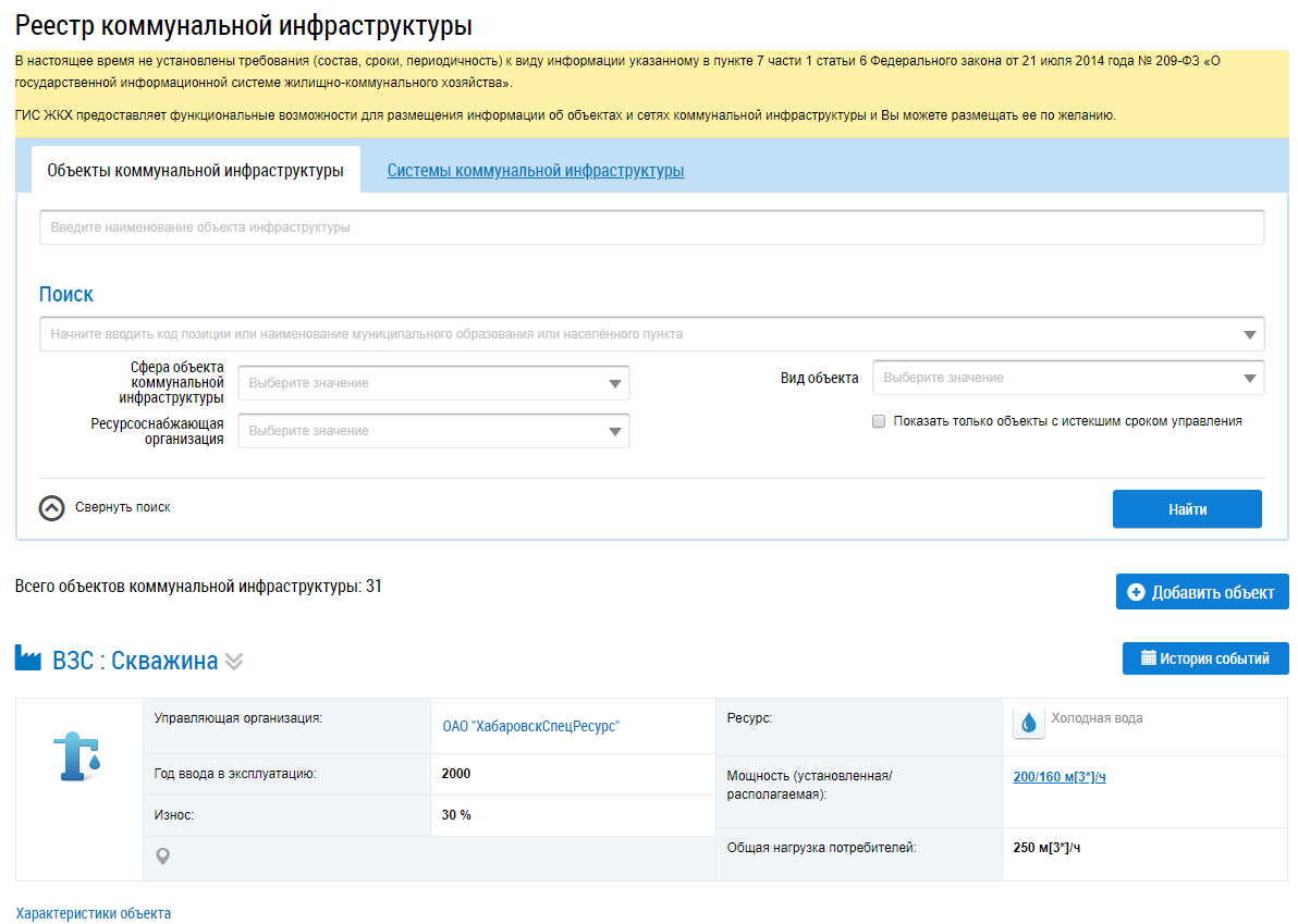 На странице отображается блок поиска и результаты поиска. Блок поиска содержит вкладки Объекты коммунальной инфраструктуры и Системы коммунальной инфраструктуры.