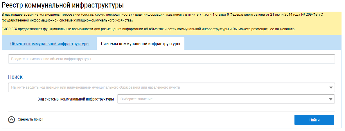 Для осуществления поиска по системам коммунальной инфраструктуры необходимо перейти на вкладку Системы коммунальной инфраструктуры.