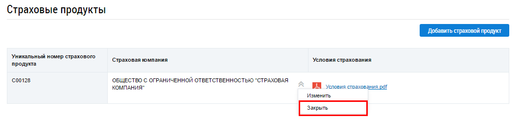 Чтобы закрыть страховой продукт раскройте контекстное меню и выберите пункт Закрыть.