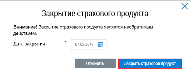 Введите дату закрытия и нажмите на кнопку Закрыть страховой продукт.