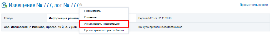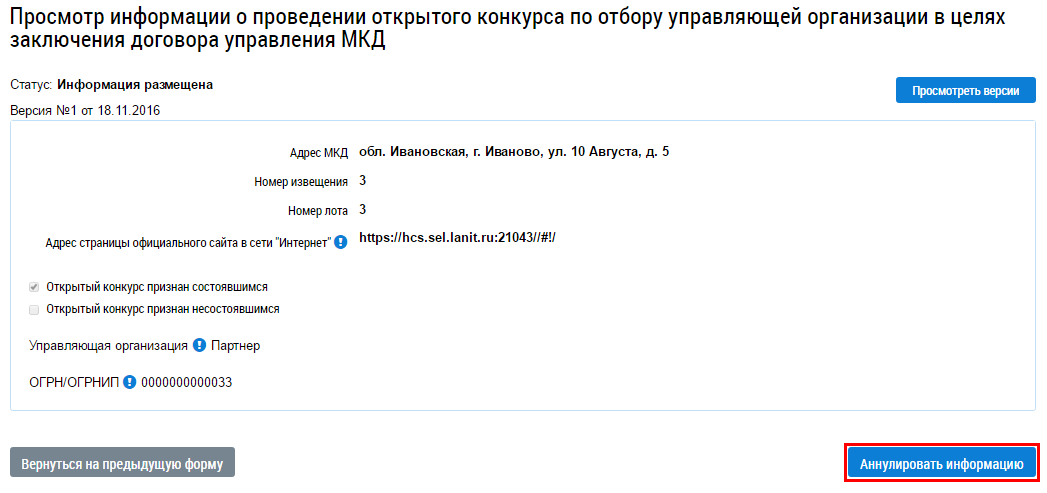 Для аннулирования информации о проведении открытого конкурса по отбору управляющей организации в целях заключения договора управления МКД выполните одно из следующих действий: выберите пункт контекстного меню Аннулировать информацию или перейдите на страницу просмотра информации о проведении открытого конкурса по отбору управляющей организации в целях заключения договора управления МКД и нажмите на кнопку Аннулировать информацию.