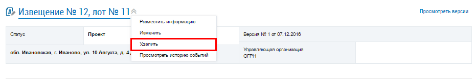 Для удаления информации о проведении открытого конкурса по отбору управляющей организации в целях заключения договора управления МКД выберите пункт контекстного меню Удалить.