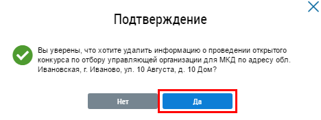 Удаление информации о проведении открытого конкурса по отбору управляющей организации в целях заключения договора управления МКД
