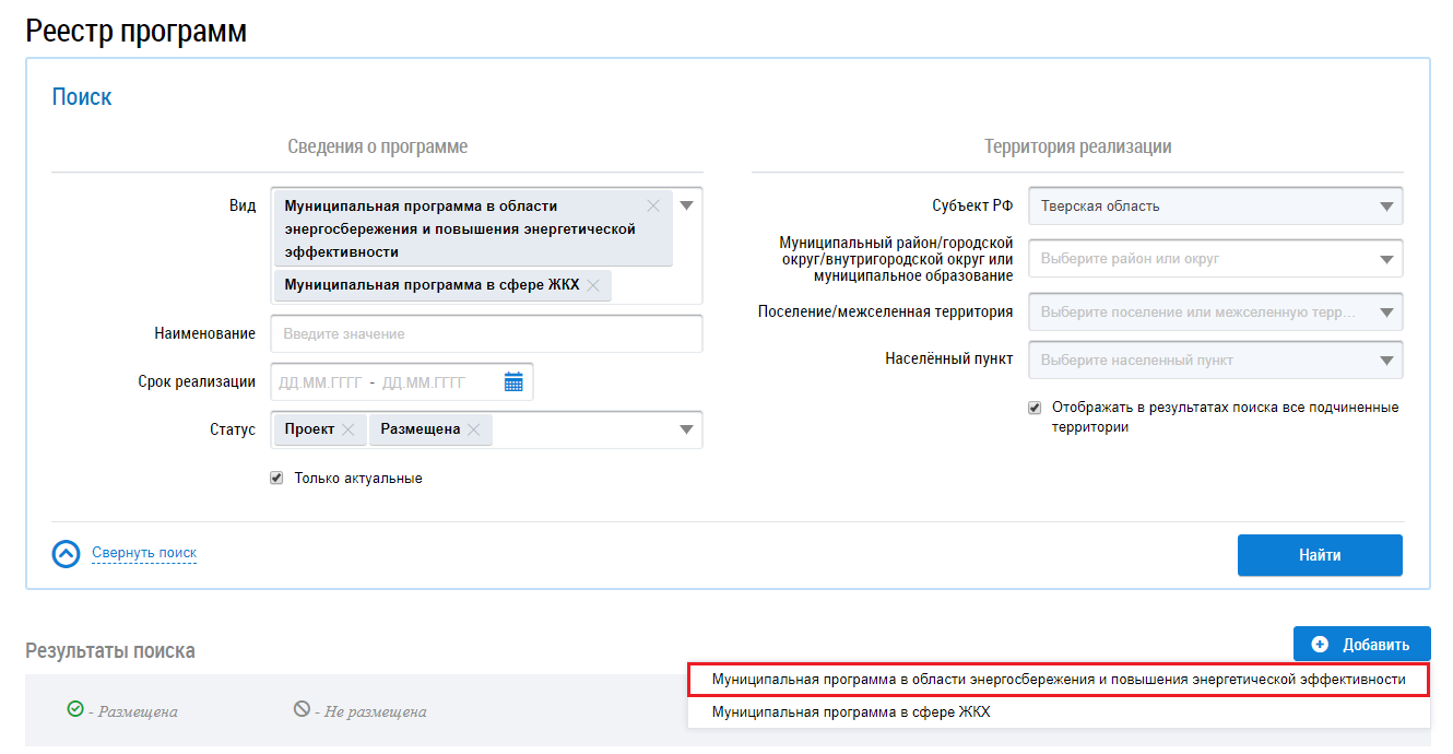 Для добавления муниципальных программ в области энергосбережения и повышения энергетической эффективности нажмите на кнопку «Добавить», в выпадающем меню кнопки выберите пункт Муниципальная программа в области энергосбережения и повышения энергетической эффективности.