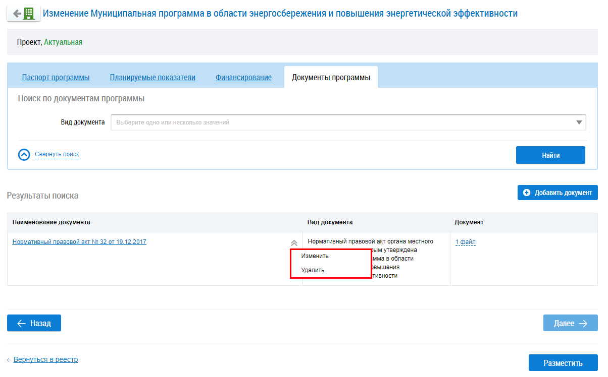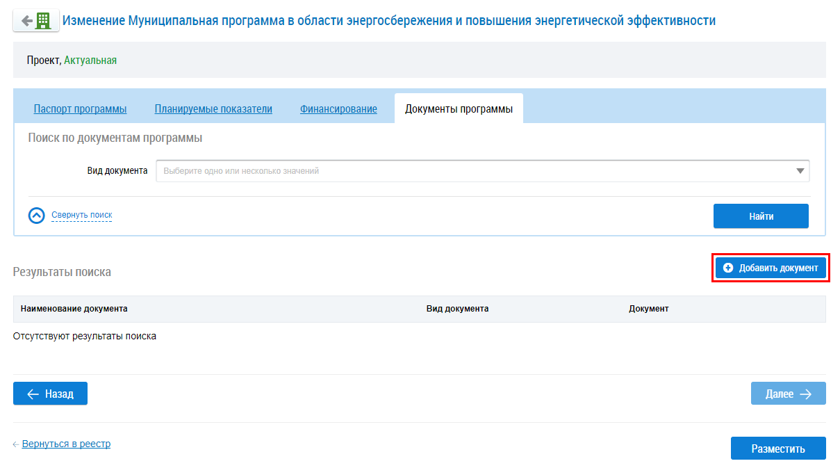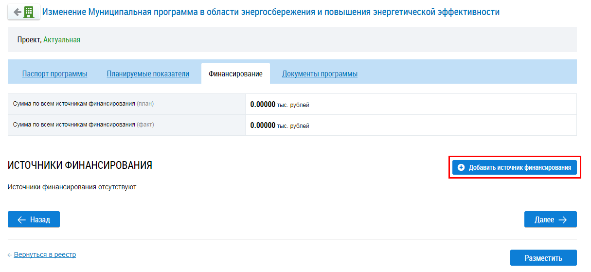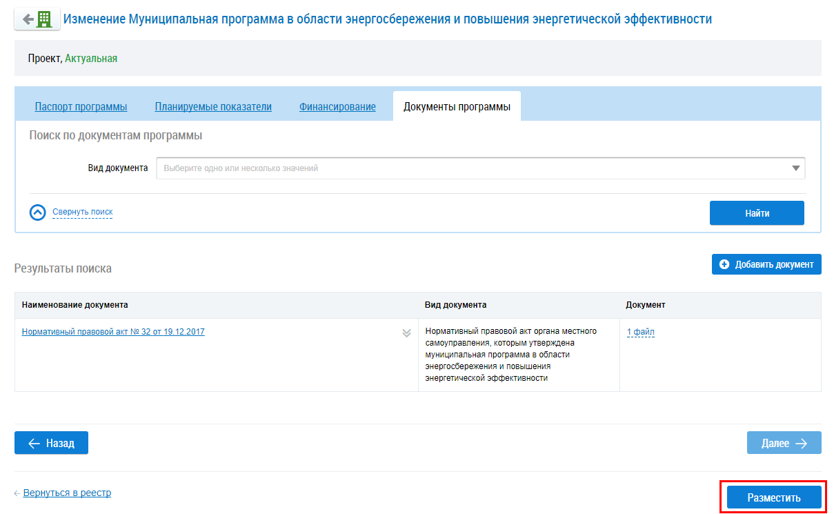 Для размещения сведений о программе нажмите на кнопку Разместить.