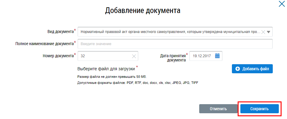 В отобразившемся окне Добавление документа заполните обязательные поля, прикрепите электронный образ документа и нажмите на кнопку Сохранить.