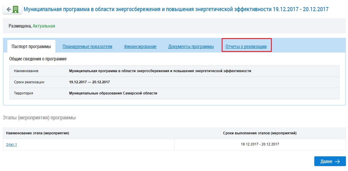 На странице муниципальных программ в области энергосбережения и повышения энергетической эффективности после размещения сведений о программе появится вкладка Отчеты о реализации.