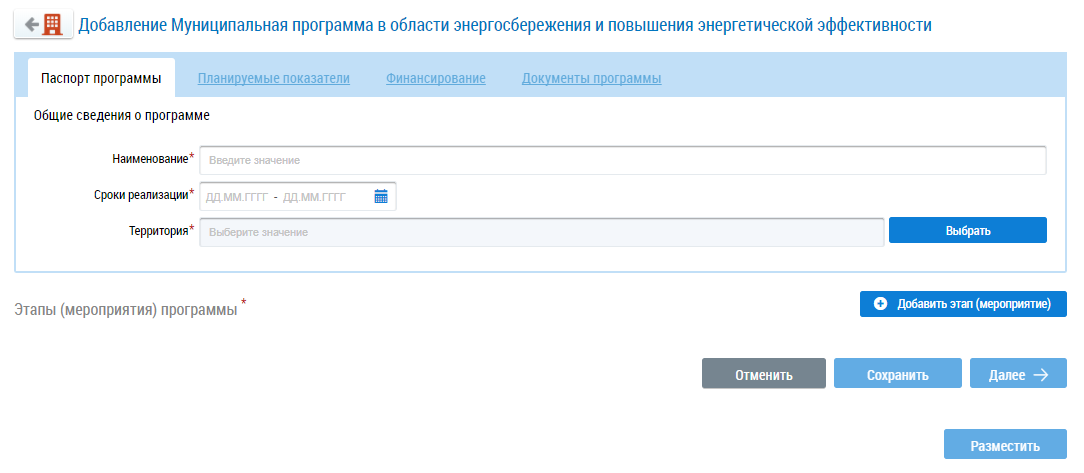 Отображается страница Добавление Муниципальная программа в области энергосбережения и повышения энергетической эффективности.