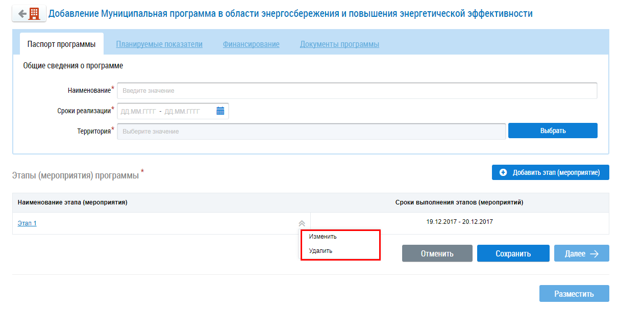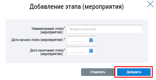 Для добавления этапа (мероприятия) нажмите на кнопку Добавить этап (мероприятие).