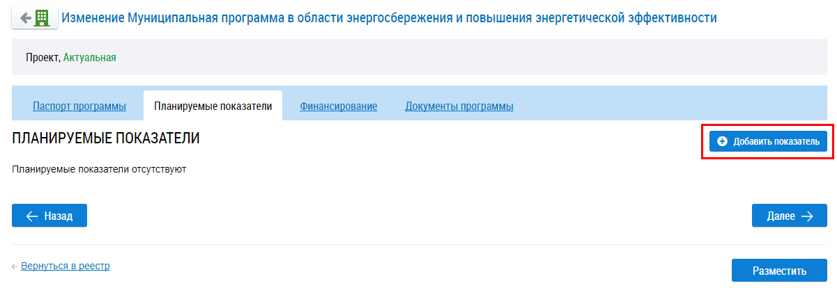 Чтобы добавить информацию о планируемом показателе нажмите на кнопку Добавить показатель.