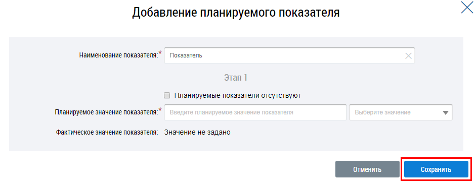 В отобразившемся окне Добавление планируемого показателя заполните обязательные поля и нажмите на кнопку Сохранить.