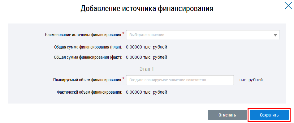 В отобразившемся окне Добавление источника финансирования заполните обязательные поля и нажмите на кнопку Сохранить.