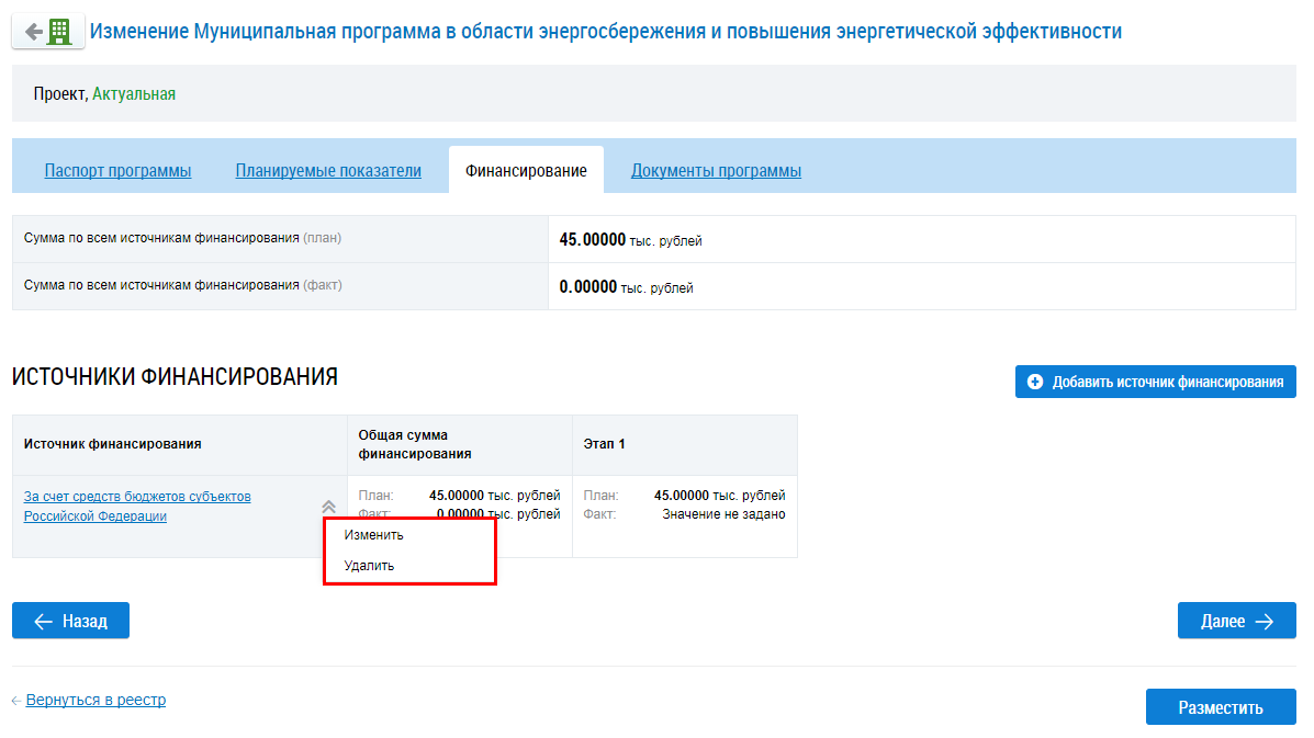 Чтобы изменить сведения об источнике финансирования раскройте контекстного меню и выберите пункт Изменить (Окно «Добавление источника финансирования». Кнопка «Сохранить»). Отображается форма аналогичная форме добавления источника финансирования (Страница «Добавление Муниципальная программа в области энергосбережения и повышения энергетической эффективности»).