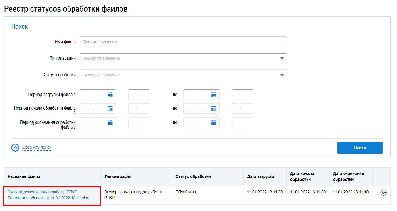 Файл добавлен в очередь для обработки. Посмотреть статус обработки можно на странице Реестр статусов обработки файлов. Затем нажмите на гиперссылку с названием файла в статусе Обработан.
