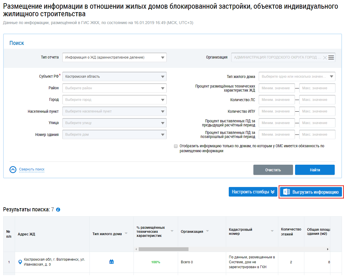 Чтобы выгрузить информацию по ЖД, нажмите на кнопку Выгрузить информацию на странице Размещение информации в отношении жилых домов блокированной застройки, объектов индивидуального жилищного строительства.