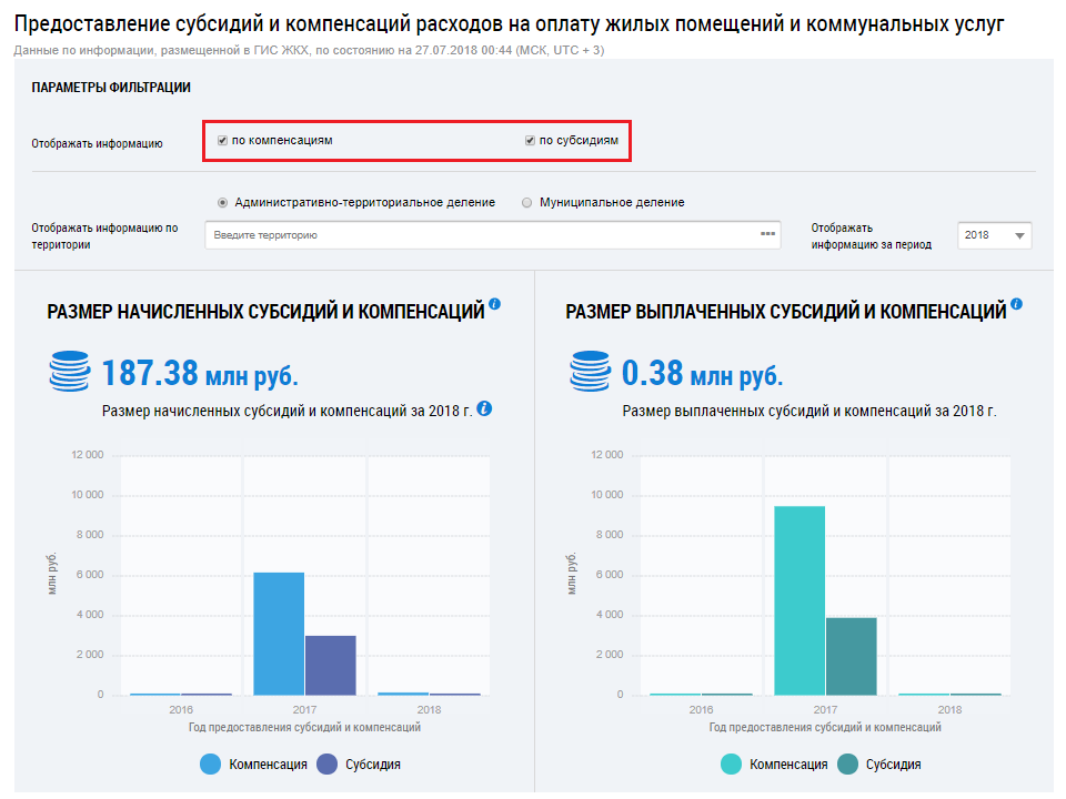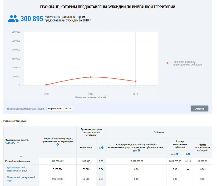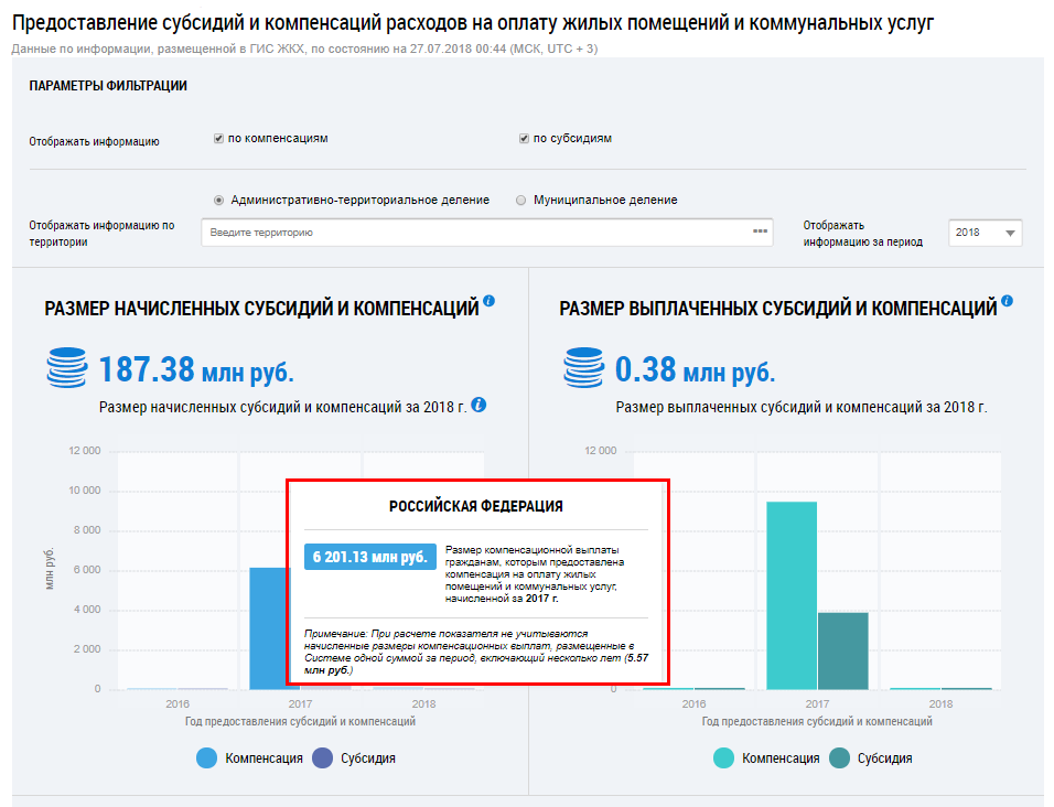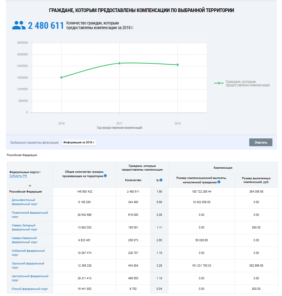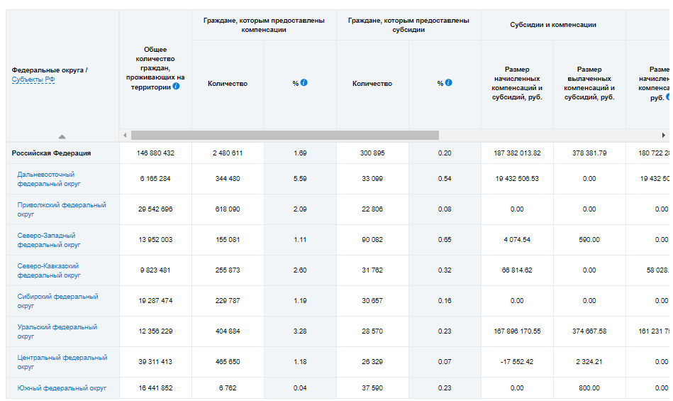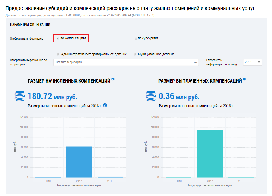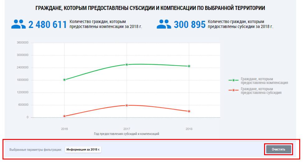 Под блоком поиска представлены три диаграммы, которые содержат информацию о размере начисленных субсидий/компенсаций; о размере выплаченных субсидий/компенсаций; о гражданах, которым предоставлены субсидии/компенсации по выбранной территории.
