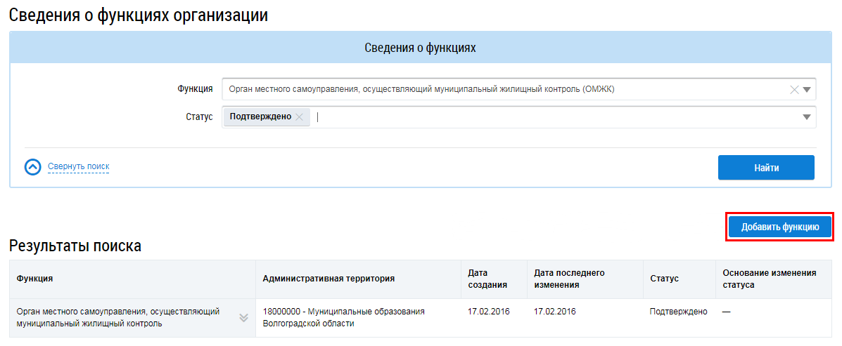 Для добавления функции организации нажмите на кнопку Добавить функцию на странице Сведения о функциях организации.