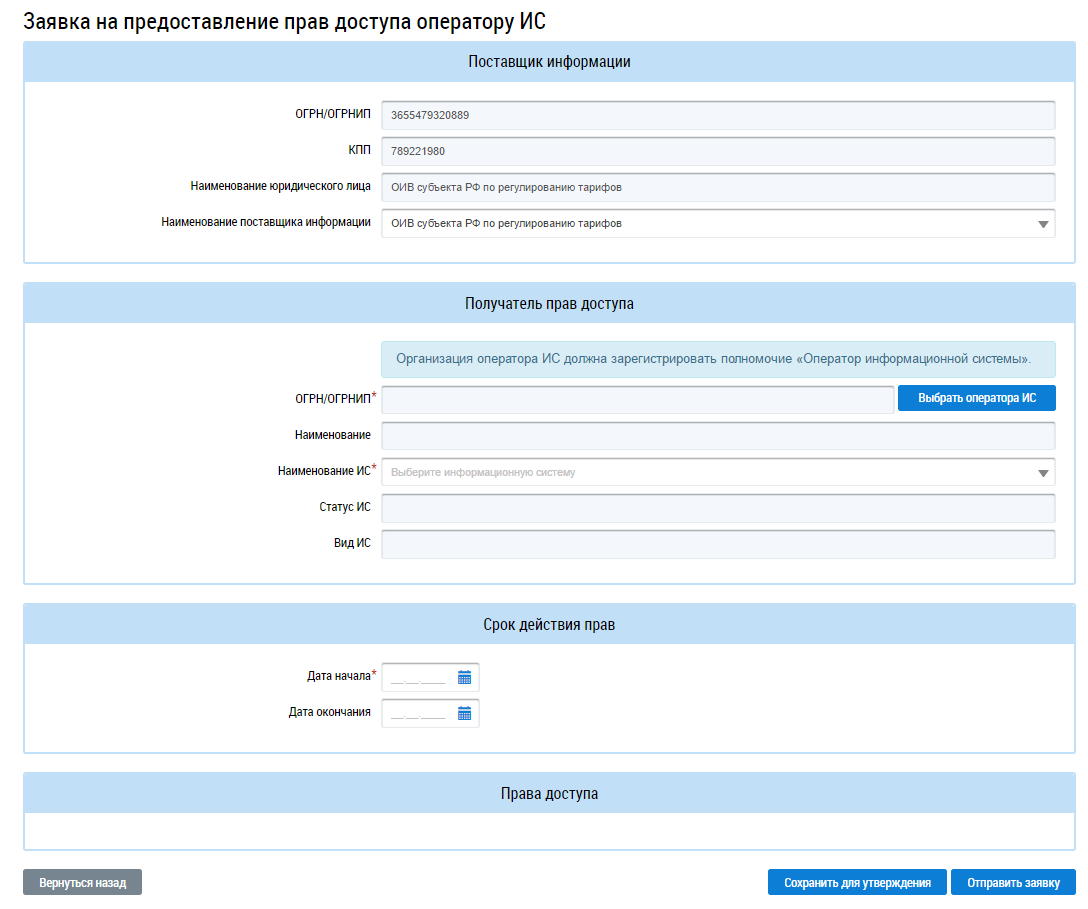 - администратору организации, который не является руководителем – с возможностью сохранения заявки без отправки Оператору ИС, для дальнейшего утверждения и отправки руководителем организации.