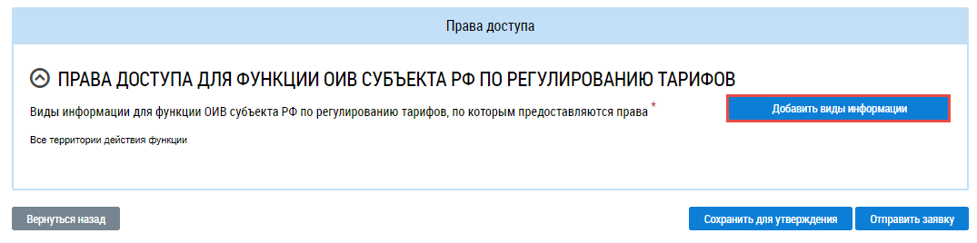 Укажите виды информации, по которым предоставляются права. Для добавления видов информации нажмите на кнопку Добавить виды информации.