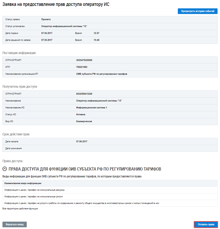 Операция отзыва прав доступа доступна для заявок в статусе Принята.