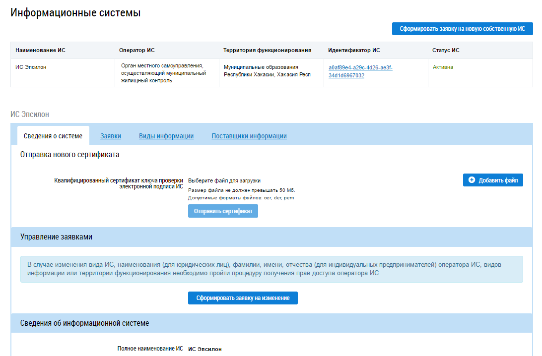 Работа с информационными системами: формирование и отзыв заявки на ИС, просмотр информации об ИС, отправка сертификата ключа.