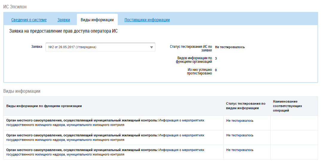 Вкладка Виды информации содержит сведения о тестировании ИС и результатах тестирования, если была подана заявка на тестирование. Для просмотра результатов тестирования определенной заявки выберите в выпадающем списке поля Заявка необходимое значение.