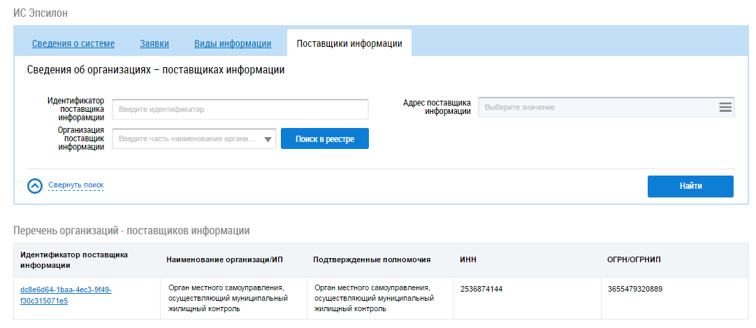 В случае необходимости воспользуйтесь блоком поиска организации. Установите необходимые параметры поиска и нажмите на кнопку Найти. В блоке Перечень организаций-поставщиков информации отобразятся организации, соответствующие поисковому запросу.