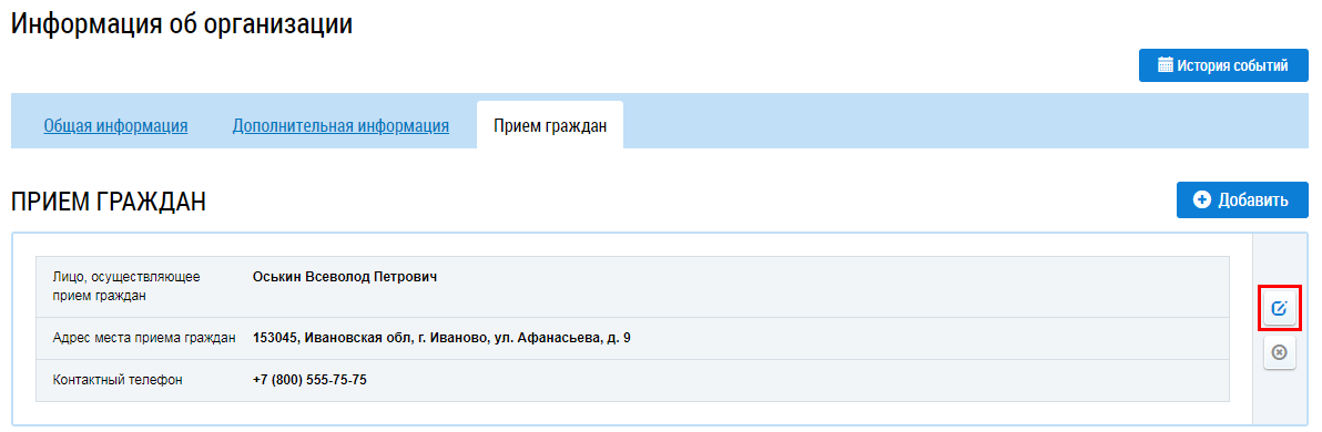 Для редактирования информации о приеме граждан нажмите на пиктограмму редактирования напротив блока с подлежащей редактированию информацией о приеме.