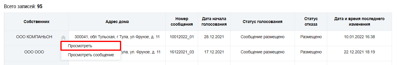 Отказ собственника также можно просмотреть во вкладке Сообщения о проведении общего собрания. Для этого раскройте контекстное меню нужного сообщения и выберите пункт Просмотреть.