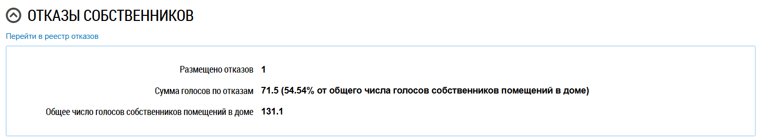 В блоке Отказы собственников отображается информация о количестве размещенных отказов и сумме голосов по этим отказам на момент размещения отказа.