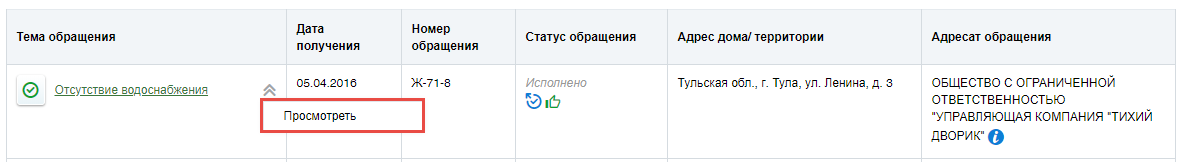 Для просмотра информации об обращении выберите пункт контекстного меню Просмотреть.