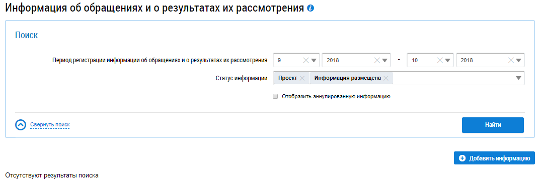 Для просмотра и добавления информации об обращениях и о результатах их рассмотрения в блоке Обращения выберите пункт Полученные обращения и далее пункт Информация об обращениях и о результатах их рассмотрения.