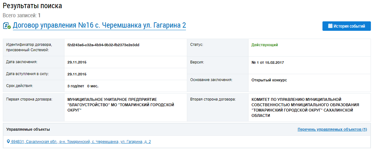 Для осуществления поиска договоров управления и уставов заполните одно или несколько полей блока поиска и нажмите на кнопку Найти. Чем точнее будут заданы критерии поиска, тем уже будет выборка результатов.