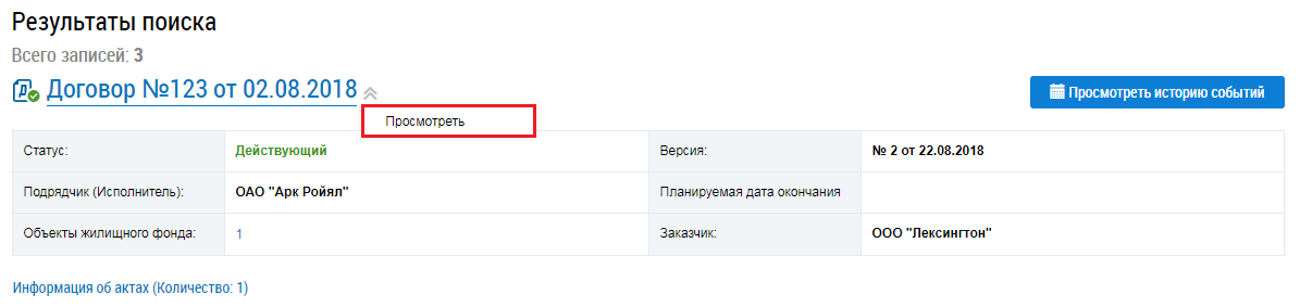 Для просмотра договора оказания услуг по содержанию и (или) выполнению работ по текущему ремонту общего имущества в МКД нажмите на гиперссылку с номером договора или раскройте контекстное меню и выберите пункт Просмотреть.